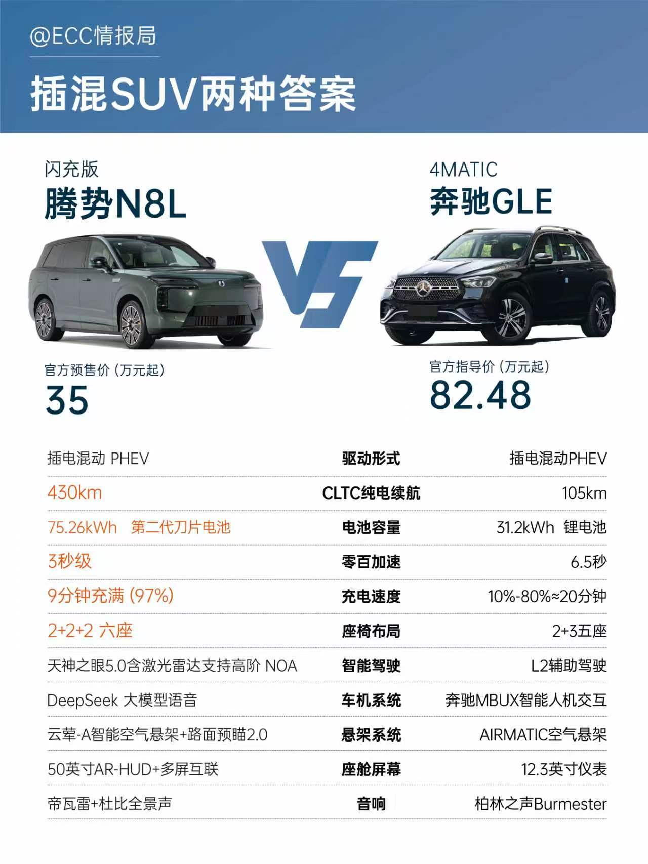 先说最关键的补能和纯电能力,腾势N8L这套已经不太像传统插混了,纯电续航做到430km,日常通勤、接娃基本可以当纯电车用,再加上5 分钟充好、9 分钟充饱,高速服务区上个厕所,电基本就补完了;而GLE本质还是老逻辑,电是辅助而不是主力。