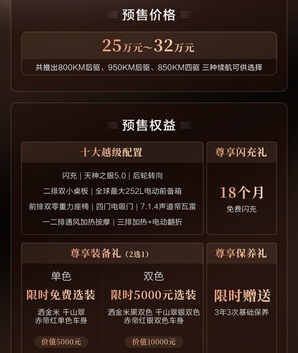 动力方面,EV版提供不同单电机及双电机,最大功率分别为300kW、370kW、585kW,将提供800km、850km、950km三种纯电续航,并提供兆瓦闪充。