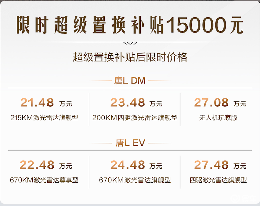 最后就是买回来了,虽然银河M9靠着最低配拉低了整体售价,但是最低配的配置简直不太够看,想要配置跟上那两车售价基本一致,并且杂乱的配置也让用户在选择时眼花缭乱。而在这一方面唐L就做的更加实在,无论是唐L EV还是唐L DM只在电池和动力上做了区分,其他配置基本全息标配,做到了舒适性和智能化的平权。唐L DM现在购车还享受1万5000元的置换补贴,补贴后售价21.48万起。