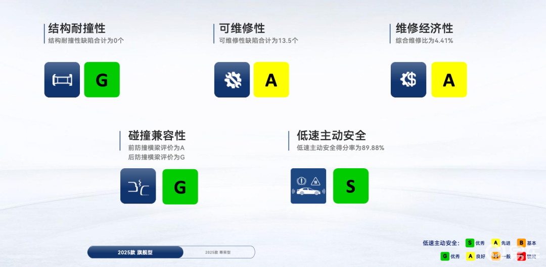 由于不是新能源车,所以只有四项。其中安全相关的三项为全优,耐撞经济与维修性为M。这也符合咱们刚才的判断:越豪华、越安全的车,其耐撞经济与维修性一般不高。