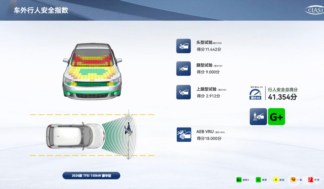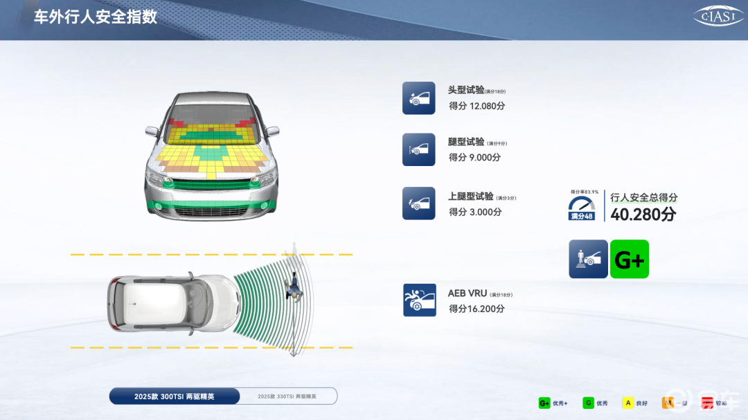 - 车外行人安全,测的是对弱势交通参与者的友好程度;