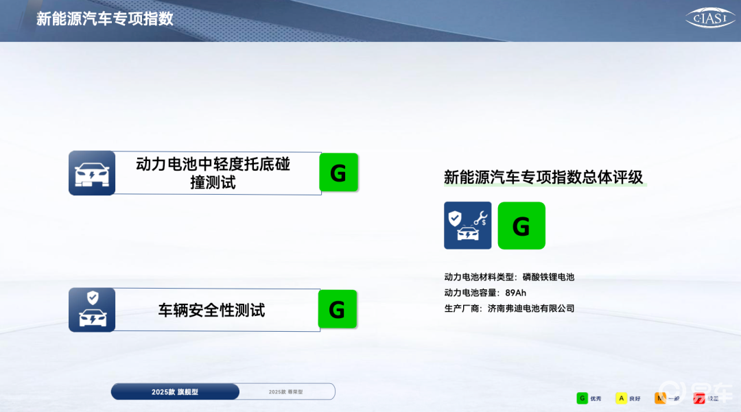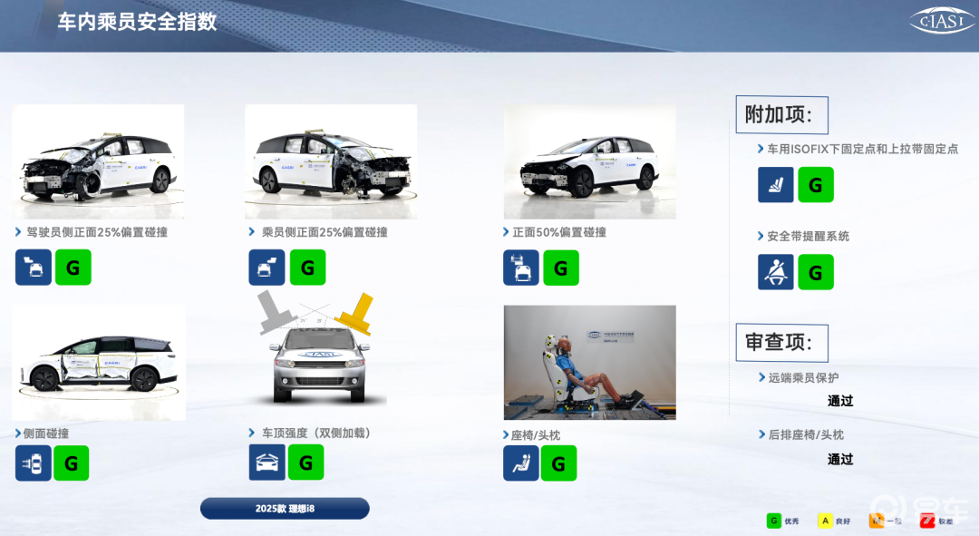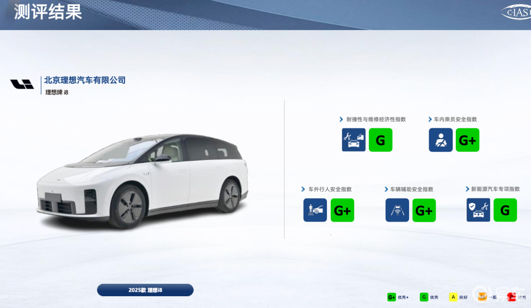 成绩上总体不错,特别是腾势N9和理想i8拿到了G/G+的五项全优成绩。