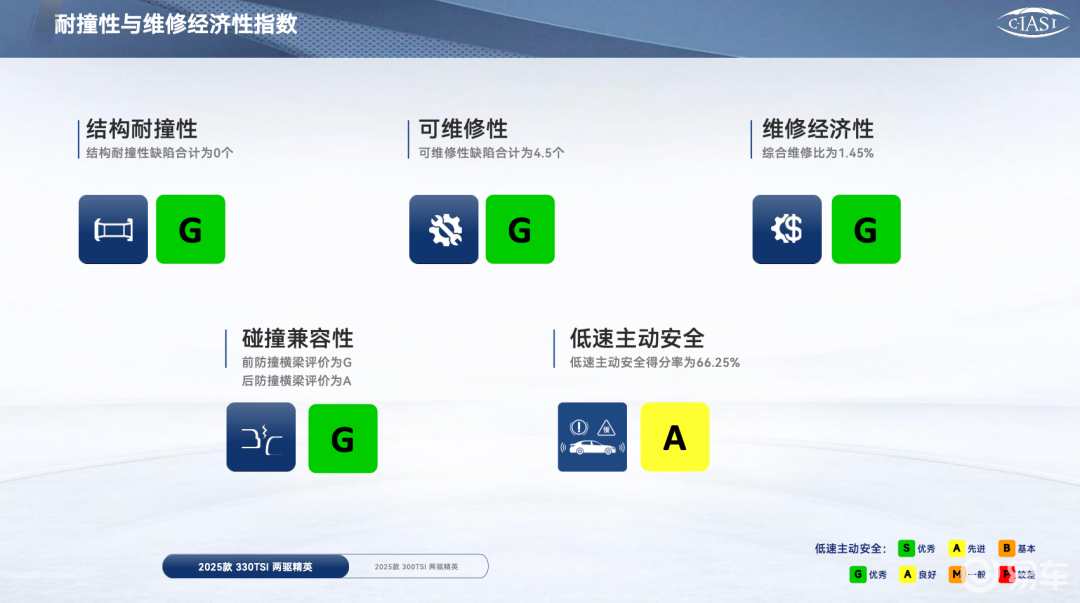 不仅三个安全项为G或G+,而且耐撞与经济维修性也会G+。这让我开始思考,也许它的技术架构更新一些? 只是猜测,还没去验证。