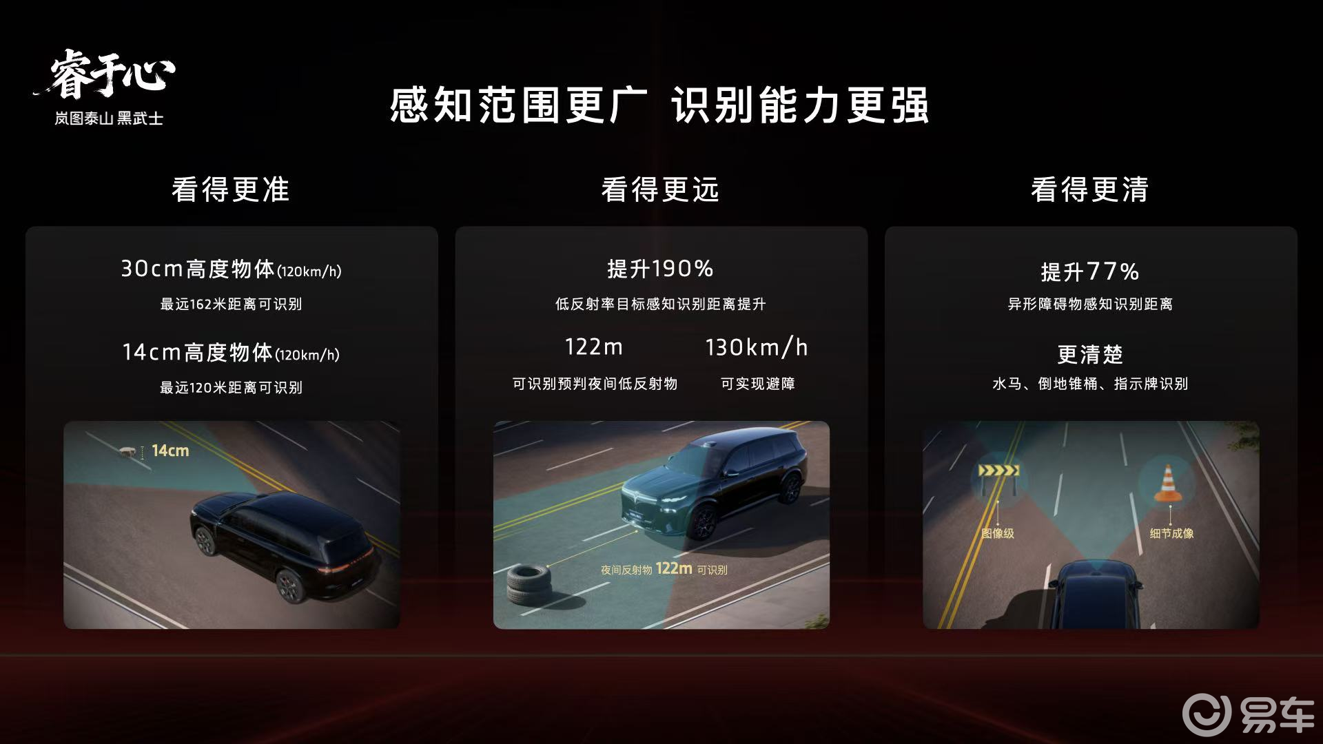 要说岚图泰山Ultra版最核心的竞争力,那必然是这套拉满的智驾系统,毕竟这是首款搭载全球最高规格896线双光路图像级激光雷达的旗舰SUV。和传统的192线激光雷达比起来,896线的这款直接实现了断层领先,30cm高度的障碍物最远能识别162米,就连14cm的小目标,识别距离也能达到120米,真正实现了从“点云级”到“图像级”的跨越,这感知能力在目前的量产车中,妥妥的第一梯队。而且岚图还玩了个狠的,直接上了四激光雷达矩阵,再加上高清摄像头、毫米波雷达等34颗智慧传感器组成的融合感知体系,全场景无死角的感知网络直接搭成,不管是复杂路况还是突发情况,都能第一时间捕捉到。